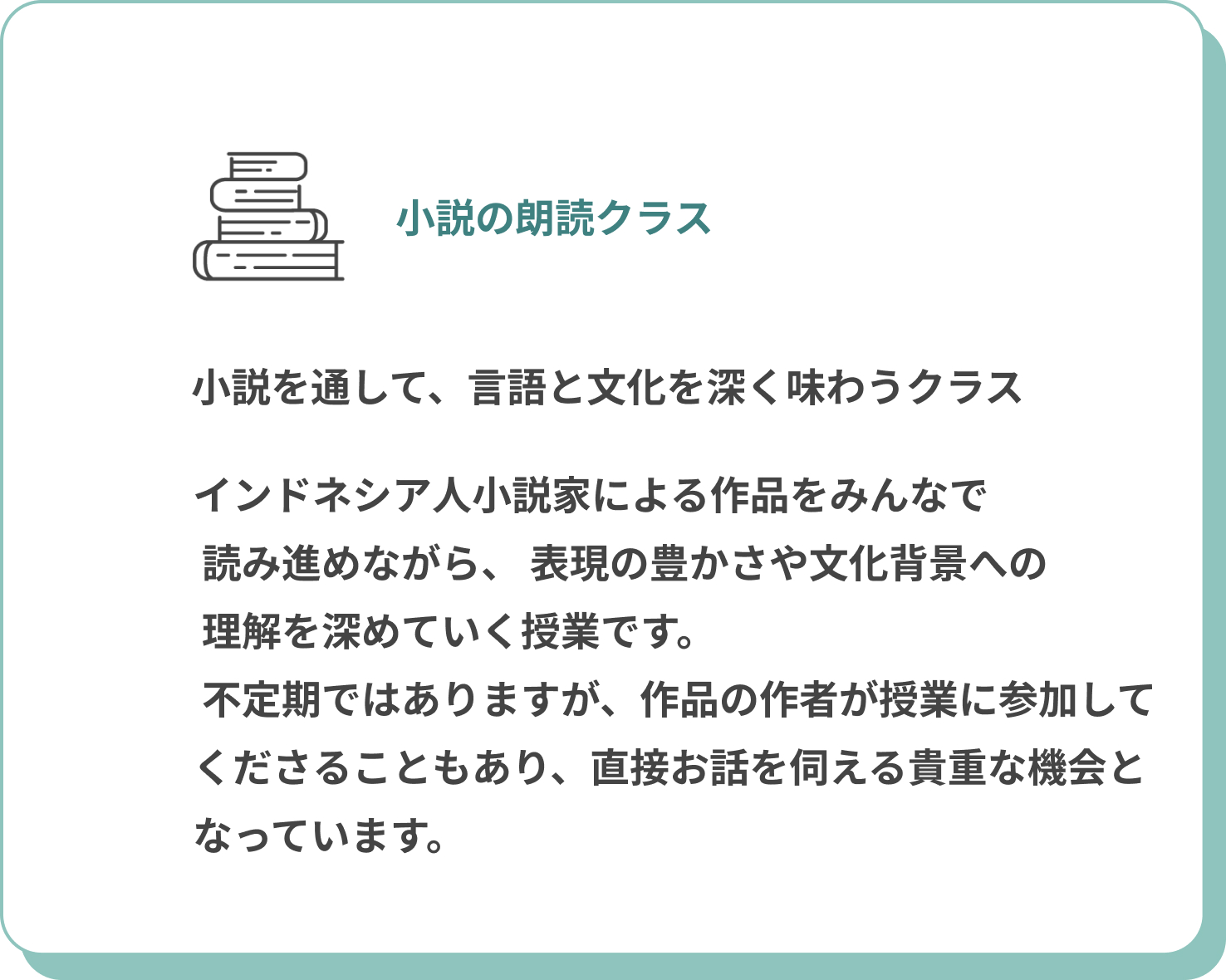 インドネシアの時事・文化・小説など、教科書では得られない“本物のインドネシア語”を学習。